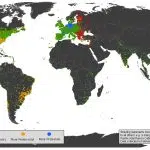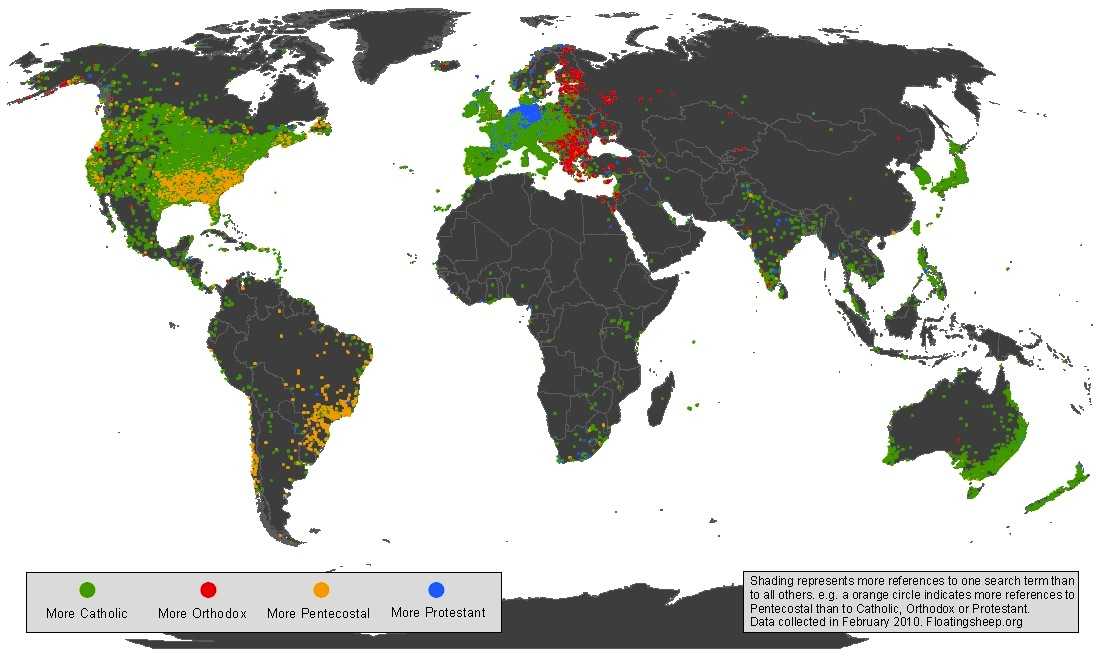 Floatingsheep.com’s map of the prevalence of Christian denominations around the world. See http://www.floatingsheep.org/2010/03/mapping-christianity.html